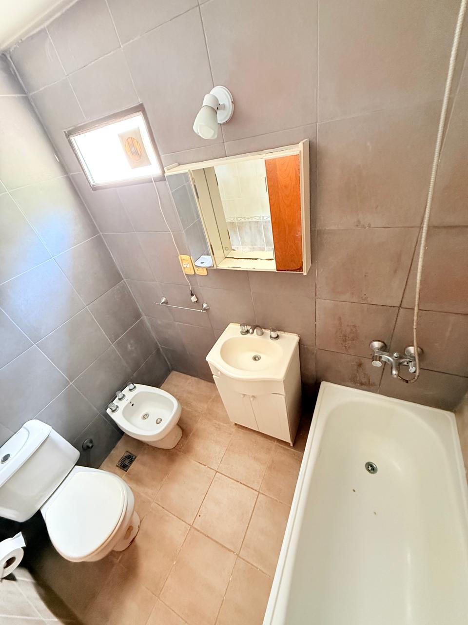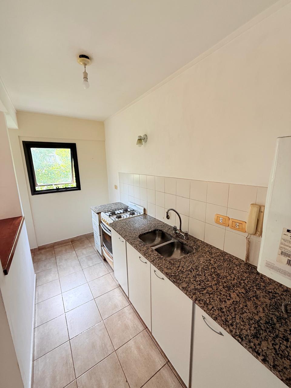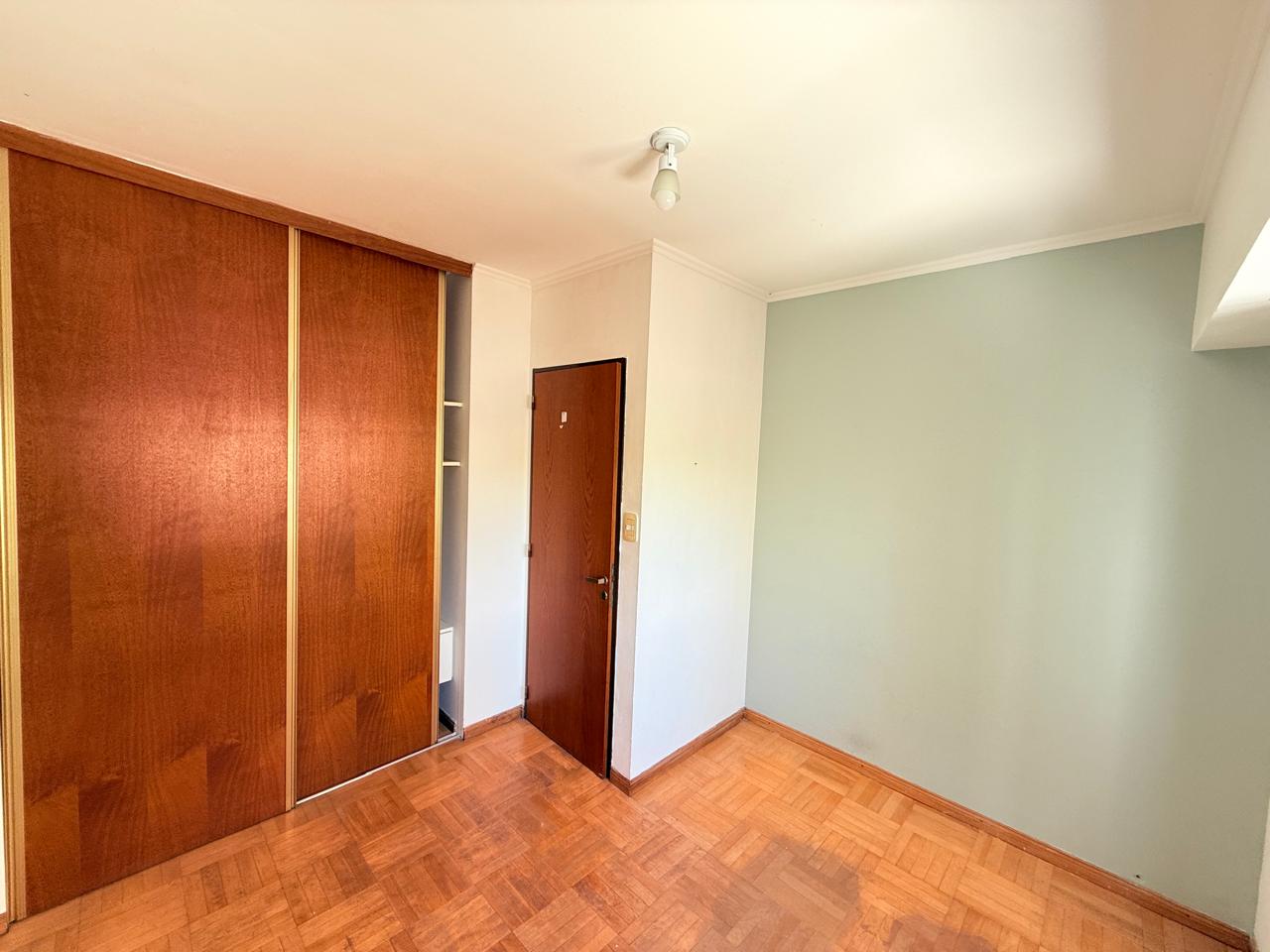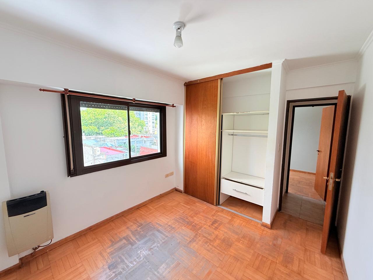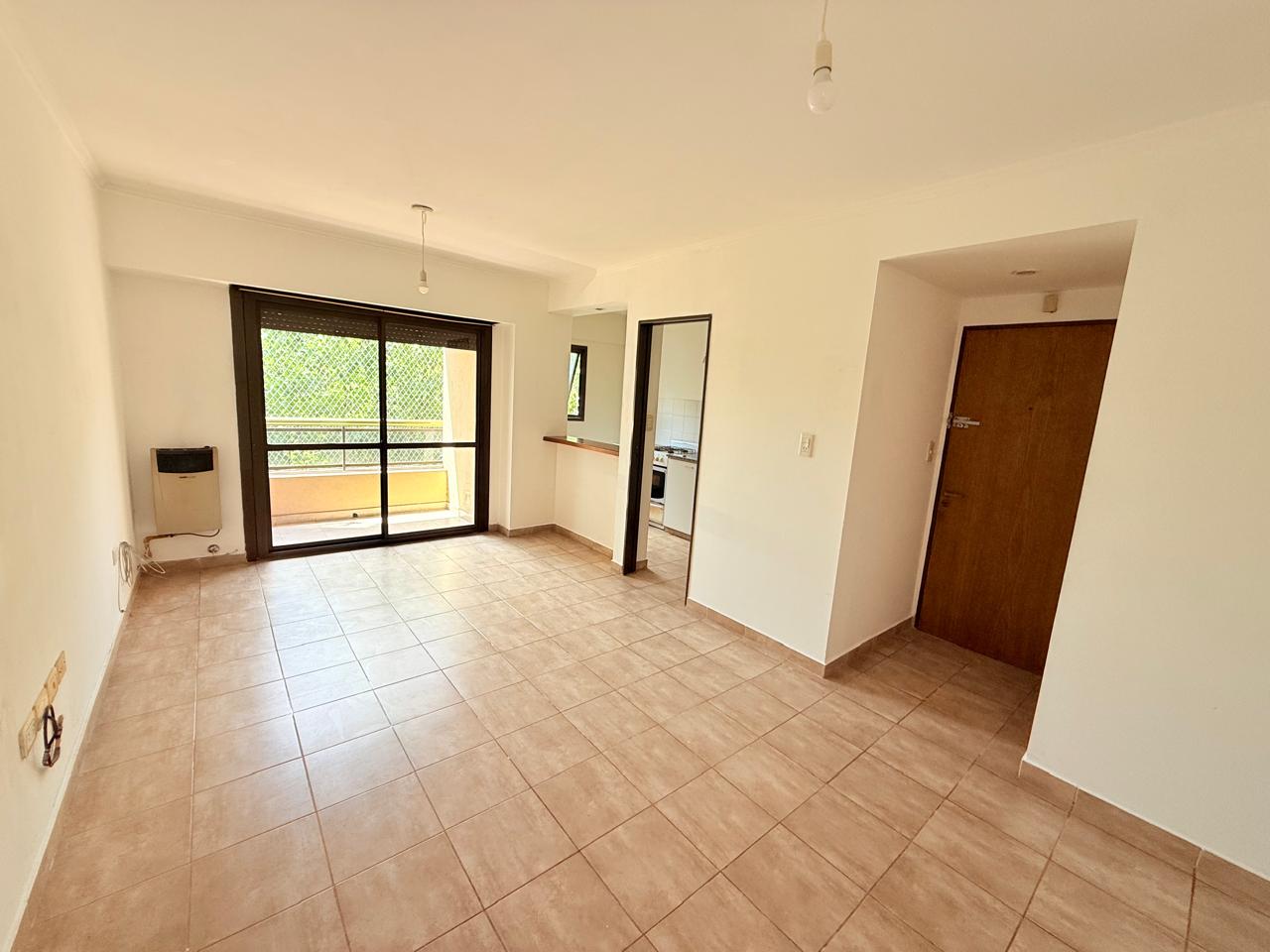 Departamento en alquiler de dos dormitorios con al frente con cochera. Cuenta con cocina semi-integrada con conexion para lavarropas, living-comedor con balcon, dormitorios con pisos de madera y placard y baño completo.