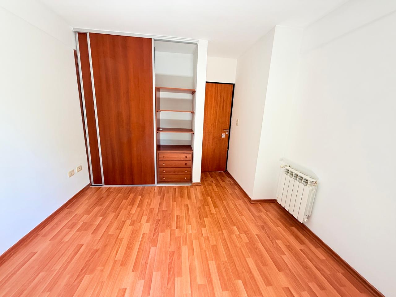 Dormitorio con pisos flotantes, aire acondicionado, puertas y ventanas con persianas, acceso al balcón y amplio placard empotrado con interior organizado.